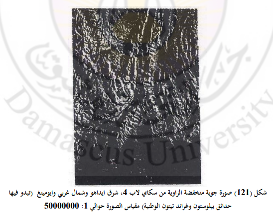 يبين الشكل (121) مثالاً للتصوير بأشعة الشمس المائلة بزاوية صغيرة التقطت في الشتاء حيث يظهر الغطاء الثلجي. ويبين هذا الشكل صورة من سكاي لاب (Skylab الشمال غربي وايومينغ (Wyoming) وشرقي أيداهو (Idaho)، حيث تمثل المنطقة ذات الشدة اللونية الفاتحة في أعلى اليسار سهل نهر سنيك Snake River في أيداهو وهي منطقة شاسعة مؤلفة من صبة بازلتية بركانية. أما المساحة ذات الشدة اللونية القائمة أعلى الصورة المغطاة بالأشجار ويمينها فتمثل حديقة ييلوستون (Yellowstone) الوطنية ويشاهد أسفل الحديقة المذكورة ويسارها جبال غراند تيتون (Grand Teton) ومنخفض جاكسون Jackson Hole. وتشاهد طبقات الصخور الرسوبية لسلسلة جبال وايومينغ وسلسلة سولت ريفر (Salt River) في التربيع اليساري الأسفل من الصورة وسلسلة جبال ويندريفر (Wind River) المغطاة بالجليد أسفل اليمين.
