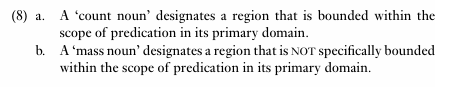 The modifier ‘specifically’ in (8b) relates to the fact that the nominal expression itself does not specify bounding, regardless of whether the mass evoked by the expression is bounded in reality. Consider the following examples: