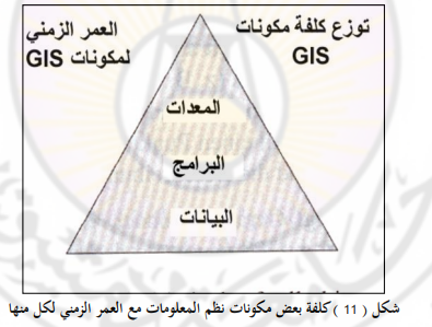 المعادلات الرياضية المنفذة بخطوات متتابعة الخوارزميات (Algorithm) توظف داخل برمجيات نظم المعلومات الجغرافية بطريقة تمكـن مـن حـل العديد مـن الاستفسارات المكانية على الشبكات الخطية أو على الأشكال المساحية التي يبنى لها نظام طوبولوجي تختلف مكونات نظم المعلومات الجغرافية من حيث كلفتها وعمرها الزمني فالبيانات هي الأكثر كلفة والأطول عمراً بين المكونات، تليها البرمجيات ثم المعدات.