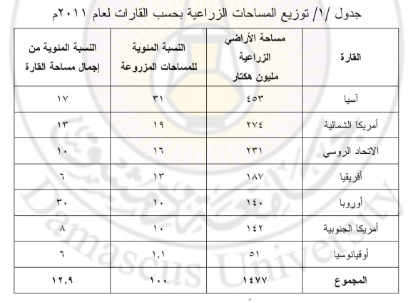 تبلغ مساحة الأراضي الزراعية في العالم نحو 14.8 مليون كم2، وهذا ما يعادل12.9 % من مساحة اليابسة. كما تختلف مساحة الأراضي الزراعية بين قارات ودول العالم، فترتفع في القارة الأوروبية نسبتها علـــى 30% مــن مساحة القارة لوقوعها في العروض المعتدلة، ولارتفاع مستوى التقدم التقني في هذه القارة وتقل نسبة الأراضي الزراعية عن 10% في أراضي روسيا الاتحادية وكندا، وذلك بسبب اتساع مساحة الأراضي الجليدية والغابات المخروطية والمراعي فيهما. كما تنتشر المساحات الصحراوية والهضاب والجبال العالية في القارة الأسيوية مما أدى إلى انخفاض نسبة المساحات الزراعية، والتي انحصرت في مساحات محدودة مثل سهل الصين ووديان الهند الصينية.