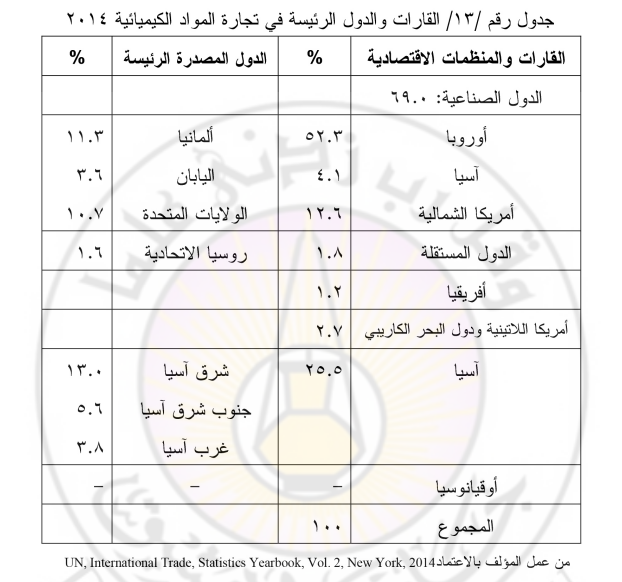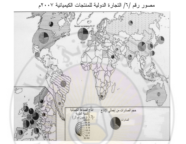 وتركزت الصناعات الكيمائية في الدول الأوروبية التي بلغت صادراتها من المواد الكيميائية حوالي نصف الصادرات العالمية، واحتلت ألمانيا الاتحادية المرتبة الأولى ضمن الدول المصدرة لهذه المواد، وبلغت نسبة صادراتها نحو 11 % وتلتها الولايات المتحدة الأمريكية بالمرتبة الثانية وحل اليابان بالمرتبة الثالثة تطورت صناعة المنتجات الكيميائية في الدول الآسيوية وخاصة في كوريا الجنوبية واندونيسيا وسنغافورة والصين الشعبية والهند وغيرها، مشكلة أكثر من ربع الصادرات العالمية للمنتجات الكيميائية والمصور رقم /6 / يبين المناطق الرئيسة لإنتاج الصناعات الكيميائية ونسبة الصادرات منها.