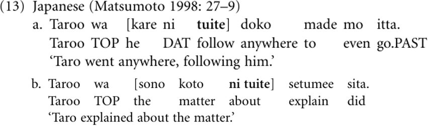 How this grammaticalization affects the structure of the verb undergoing the process has been shown in more detail by Matsumoto (1998) for Japanese. This language has a wide range of postpositions which are historically derived from verbs used in the participial-te-construction; Matsumoto (1998: 27–8) provides a list of 26 such postpositions. The following is a typical example of such a postposition. In (13a) the verb tuku (participial form: tuite) is exemplified, having the lexical meanings ‘stick to, follow, take the post of’, while (13b) illustrates the same item in combination with the dative marker ni as a functional category, namely as a postposition meaning ‘about, concerning’. Since the verb follows its complement in Japanese, the resulting forms develop into postpositions rather than prepositions.