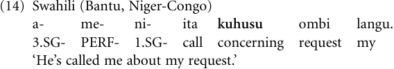 As a rule it is not finite verbs, inflected for person, tense, etc., that are grammaticalized but non-finite verb forms, such as infinitival or gerundival/participial verbs, as in our Japanese example. In English, prepositions are most commonly derived from present participle forms (barring, concerning, considering, during,1 excepting, failing, following, notwithstanding, pending, preceding, regarding) or past participle verb forms (given, granted); in the Bantu language Swahili, it is generally the infinitive prefix ku- that turns verbs into prepositions, for example ku-pitia ‘to pass by’ > kupitia ‘through, via’, ku-toka ‘to come from’ > kutoka ‘from’, ku-husu ‘to give a share to’ > kuhusu ‘concerning, about’, for example: