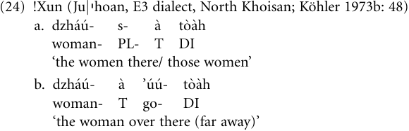 Archaic Chinese provides one example: The motion verb ZHI ‘to go’ has developed into a proximal demonstrative ‘this’ (Heine and Kuteva 2002a: 159). But clearly cases where the resulting demonstrative function is distal rather than proximal are more common. For example, in the Chadic language Mupun (or Mopun), the verb ’dı̀ ‘go’ appears to have given rise to a distal demonstrative (Frajzyngier 1987), and similar examples can be found in the Khoisan family. In the E3 dialect of !Xun (Ju ǀˡhoan) of the North Khoisan family, the verb tȍ ’à ‘go’ seems to have provided the source for the distal demonstrative tòàh ‘that’, cf. (24a). That this hypothesis is correct is supported by the fact that there is another verb for ‘go’, ˡu̒u̒, which is also used as a demonstrative marker, added to the distal demonstrative to form another demonstrative denoting extreme distance (‘that, far away’), cf. (24b).