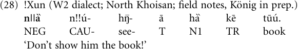 Otherwise, verbs giving rise to negation markers are in particular ‘lack’, ‘miss’, ‘leave’, and ‘fail’ (Heine and Kuteva 2002a: 188, 192–3). For example, the verbs WU and WANG of Archaic Chinese, both meaning ‘lack’, developed into negative markers (Alain Peyraube, p.c.). Once again, there are a number of Kru languages which underwent this grammaticalization (Marchese 1986: 183), and in the Khoisan language !Xun (W2 dialect), the negation marker in modally marked sentences is nǀǀȁ (or nǀǀȁn), which is likely to be derived from the verb nǀǀȁn ‘leave, abandon’, for example:
