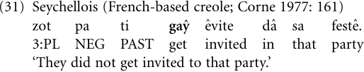 Verbs meaning ‘get, acquire’, including English get, crosslinguistically provide a common source for passive markers. For example, in the French-based Indian Ocean creoles, the French verb gagner ‘to gain’ has turned into a passive marker gaŷ: