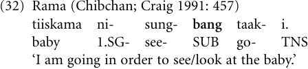 Verb > subordinator Subordinators, that is, markers introducing adverbial clauses, can be derived from a wide range of verbs depending on their particular function (see Heine and Kuteva 2002a for examples). Since we will deal with this issue in more detail, one example may suffice to illustrate this pathway. In this process, the parameter of extension has the effect that the use of the verb is extended from nominal complements to adverbial clauses, the lexical meaning of the verb is desemanticized, what remains is the syntactic ability of the verb to take a complement, and via decategorialization the verb loses most, if not all, verbal properties. The following example illustrates the grammaticalization of the verb bang ‘go’ to-bang, a subordinating conjunction of goal or purpose in the Central American language Rama.