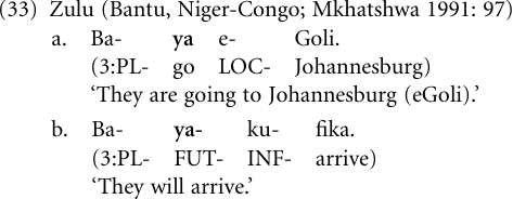 Verb > tense In the same way as they give rise to markers of verbal aspect, lexical verbs combine with other verbs, assume the role of auxiliaries and turn into tense markers. In this way, English acquired two future tense categories, will and be going to, by grammaticalizing a verb of volition (will-an) and of motion (go to) to tense markers. Similar processes have occurred in a wide range of languages all over the world, whereby verbs meaning ‘want’, ‘come to’, or ‘go to’ turned into future markers. The following example from the South African Zulu language is a case in point: The lexical verb-ya ‘go’ (33a) has developed into a remote future prefix (33b).