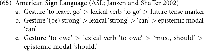 Perhaps more importantly, research on signed languages may also shed light on the question posed above, namely on whether it may not be possible to push reconstruction back to linguistic forms that preceded lexical forms. There is little doubt that at least some lexical items of signed languages that were grammaticalized to functional categories have their source in gestures, that is, in communicative expressions using the hands and face. Thus, Janzen and Shaffer (2002) propose the reconstructions in (65); note further that Wilcox and Wilcox (1995) argue that there are gestural origins for markers of evidentiality (see also Pfau and Steinbach 2006).