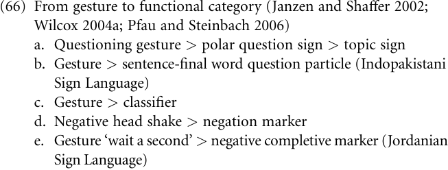 But work on signed languages provides yet another perspective that is immediately relevant for the reconstruction of language evolution. Our discussion in “Layers” suggested that functional categories can be traced back ultimately to lexical categories. As it surfaces from recent research (especially Janzen 1999; Janzen and Shaffer 2002; Pfau and Steinbach 2005, 2006), however, there is an alternative pathway for functional categories, namely one that bypasses the lexicon, leading straight from manual or non-manual gesture to functional marker, such as the ones summarized in (66). In (66a) for example, the gesture proposed as the origin of the polar (= yes–no) question marker in both American Sign Language and British Sign Language (Woll 1981) is an eyebrow raise extending over the entire proposition being questioned, which became the obligatory sign for polar questions (usually along with a forward head tilt), that is, a marker for a grammatical function. Subsequently, this marker was further grammaticalized to a topic marker, first within the pragmatic domain, subsequently within the syntactic, and finally the textual domain.