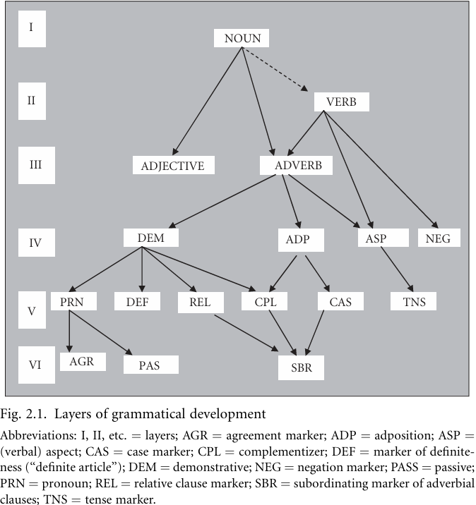 The developments sketched later can be conflated in the form of an evolutionary network as presented in Figure 2.1 in “A scenario of evolution”, where six layers of evolution are proposed. As we observed in Section “Layers”, the term ‘‘layer’’ refers to clusters of categories that show the same relative degree of grammaticalization vis-à-vis both the categories from which they are derived and which they develop into.