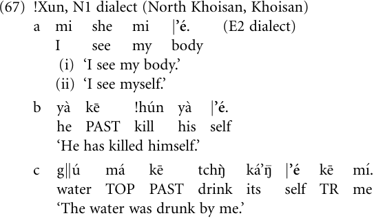 While the lexical meaning is still available in the eastern E2 dialect, the northern N1 dialect of !Xun has grammaticalized it into a reflexive and eventually also into a passive marker. Thus, example (67b)exhibits the reflexive construction, and (67c) the passive construction, where there is an inanimate subject; note that we are dealing with a fully-fledged passive that can take an agent introduced by the multi-purpose preposition kē having a transitivizing function (TR). However, the passive construction still bears witness to its nominal origin since the passive marker / ˡe̒ behaves morphosyntactically like a head noun obligatorily requiring a possessive modifier. Accordingly, cases like this one cover the whole spectrum from layer I (noun) via layer V (reflexive pronoun) to layer VI (passive marker).