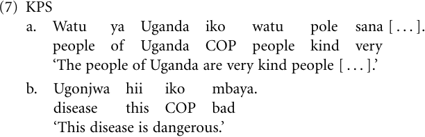 Copular structures Neither CS nor KPS require a copula in equational propositions; still, CS has a copula ni (or ndiyo) used for both classificational (John is a teacher) and identificational (The teacher is John) predications. This copula has largely disappeared in KPS, which developed a new copular use pattern by grammaticalizing the locative copula iko1 ‘be somewhere, exist’ to a general copula: Not only has iko retained the locative and existential functions of CS; as a result of its desemanticization (or generalization) it has become an all-purpose copula. The following examples illustrate its uses.