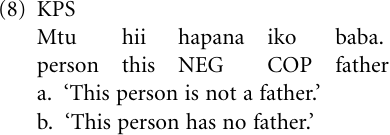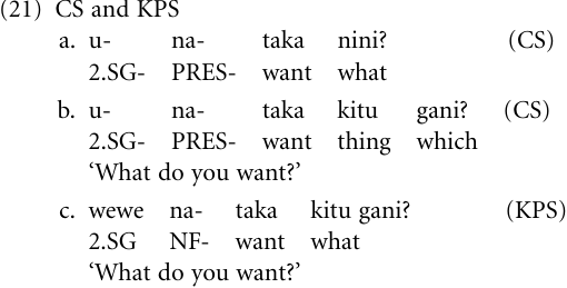 Being impoverished vis-a̒-vis the coastal varieties of Swahili (CS), from which it is historically derived, KPS experienced a number of developments within its short lifespan of roughly forty to fifty years. These developments almost invariably involved linguistic material that was available in the language but that was put to new uses of two kinds: Either it concerned free forms, that is, independent words that assumed functional roles corresponding to some of the lost inflections. For example, the person inflections ni- (1.SG), u- (2.SG), etc. were lost (except for lexicalized fossils), and their function was taken over by the self-standing pronouns mimi ‘I’, wewe ‘you (SG)’, etc. But more generally, pidgin speakers searched for ways of expressing functional concepts by drawing on universal strategies of grammaticalization, using existing lexical structures in contexts that invited novel interpretations of these structures in terms of functional concepts. We will now deal with these structures in turn.