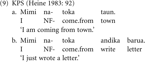 Tense–aspect Among the universal strategies used to create new categories for immediate perfects or past tenses there is one whereby verbs meaning ‘to come from’ are grammaticalized to tense–aspect markers; cf. French Il vient d’aller à Paris (he comes from to.go to Paris) ‘He has just gone to Paris.’ This strategy has also been employed by KPS speakers by developing their verb toka ‘come from’ into an immediate-past auxiliary (Heine 1991: 42): (9a) illustrates the lexical and (9b) the functional use of toka.