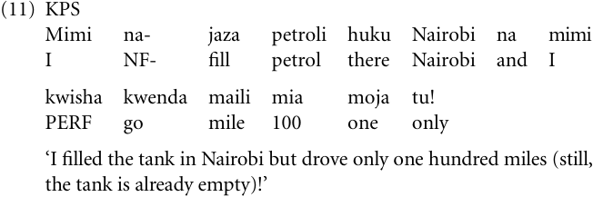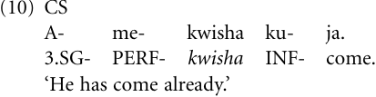 Another tense–aspect use pattern characterizing KPS concerns the grammaticalization of the verb kwisha ‘be finished’ to a perfect auxiliary. This process occurred in CS, where it has given rise to an already-perfect (denoting an event that occurred earlier than expected) in combination with the perfect prefix-me-, for example: