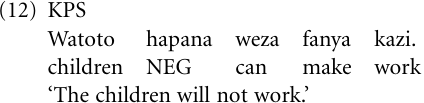 The future prefix-ta- belongs to the few inflections that have survived the transition from coastal L1-Swahili (CS) to pidgin. However, -ta- is restricted to the positive future, while the negative future is a new creation within the pidgin. An evolution from markers of ability (‘be able, can’) to future tenses is crosslinguistically not very common but is attested.2 KPS speakers appear to have used this strategy to form a negative future, using the phrase hapana weza (NEG can) or hawezi, derived from CS ha-wez-i (NEG.3.SG-can-NEG), for this purpose. Thus, the following sentence may have its literal meaning ‘The children cannot work’, but more likely is understood to express negative future meaning.