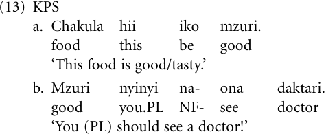 Modality One way of creating new expressions for deontic modality is to draw on a universal strategy whereby predicates of the kind ‘It is enough/ fitting/suitable/good (that)’ are grammaticalized to markers for necessity or obligation (Heine and Kuteva 2002a). KPS speakers have done so by developing the expression mzuri ‘(it is) good (that)’ into a marker of deontic modality, cf. (13).