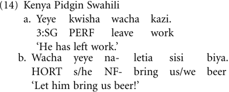 Another universal conceptual process concerns verbs meaning ‘leave’, ‘abandon’, or ‘let’ that are grammaticalized to hortative markers or related concepts of deontic modality (Heine and Kuteva 2002a). This process has given rise in KPS to a hortative use pattern: Example (14a) illustrates the lexical use of wacha ‘leave’ (< CS-(w)acha ‘leave, abandon’), that we had already in (6), and (14b) that of a hortative marker: