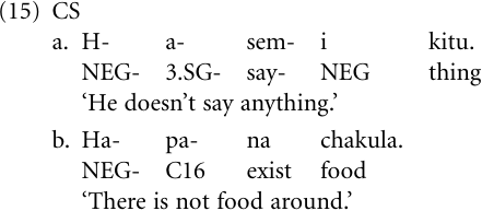 Negation One crosslinguistically common pathway leading to the rise of verbal negation markers has been described by Croft (1991); we gave a sketchy rendering of it in “The second layer: verbs” (Verb > negation). In accordance with this pathway, negative existential verbs (‘not to exist’) develop into general markers of verbal negation. In CS, verbal negation is expressed by a discontinuous structure consisting of the inflectional prefix hV- (si-in the first-person singular) and the negative suffix-i, cf. (15a). This negation structure has been eliminated in KPS except for a few, mostly lexicalized relics. Instead, early KPS speakers have drawn on the existential pathway by grammaticalizing the existential construction of CS, consisting of a negation prefix hV-, one of the three locative noun class markers pa (C16), ku- (C17), or mu- (C18), plus the existential copula-na ‘exist, be with’, illustrated in (15b).