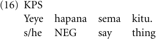 In accordance with this pathway, the CS negative existential phrase ha-pa na illustrated in (15b), using the noun class marker of the locative class 16, has been grammaticalized to an invariable verbal negation marker hapana in KPS, occurring immediately before the verb. Accordingly, the meaning of the CS sentence in (15a) would be expressed in KPS typically as in (16).