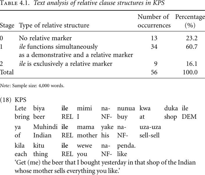 All these stages co-occur in KPS (at least when we studied it in the late 1960s). As Table 4.1 shows (see also Heine 1991: 50), the largest number of uses concern situations where ile is in some way or other ambiguous between a relative and a demonstrative reading. The use of the relative marker is in most contexts optional; however, there is a strong tendency to omit it with indefinite head nouns but use it with definite head nouns.