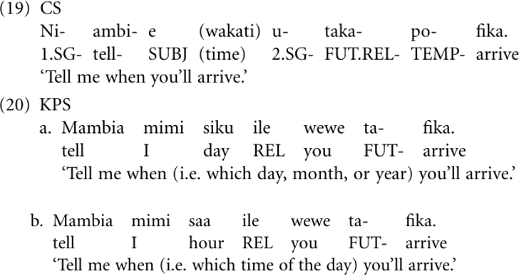 Adverbial clauses Virtually all of the developments characterizing KPS can appropriately be portrayed as being drastic reductions vis-à-vis CS. But, as the examples presented above suggest, the pidgin has somehow acquired a new typological profile that is characterized by new functional distinctions for which there is no exact equivalent in CS. In some cases this means that KPS developed grammatical distinctions that are absent in CS. For example, CS has an inflectional verbal prefix-po- introducing temporal adverbial clauses (built on the relativizer-o-), as in (19). KPS has lost this inflection and has created a new use pattern based on a lexical structure which is siku ile (‘day which’) when referring to events more distant in time, cf. (20a), and saa ile (‘hour which’) for events that happened recently, cf. (20b). Thus, KPS speakers dispose of a more differentiated grammatical distinction than CS speakers, in that for the latter there is no grammaticalized way of distinguishing between (20a) and (20b).