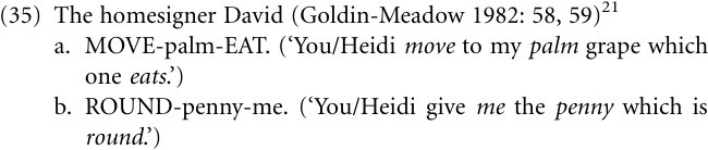Goldin-Meadow (1982) argues that homesigners use recursion in structuring their discourses. However, in the data available we found no clear evidence that there is embedding recursion.20 For example, Goldin Meadow interprets the utterance (35a) as being suggestive of subordinate linkage analogous to relativized sentences in English. Example (35a) was produced by the homesigner David to request Heidi to give him a toy grape. While we do not wish to exclude the possibility that this example reflects recursion, the evidence available is not sufficient to establish that it does. In a similar fashion, example (35b) might be suggestive of recursive noun modification [[adjective]–noun], but once again, more data would be required to show that such a structure really exists.