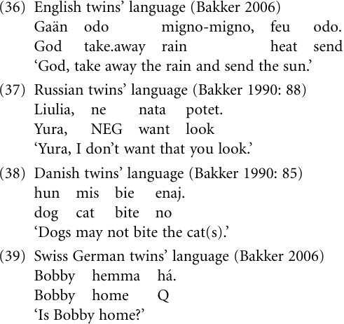 Exactly what the status of twins’ languages is vis-a `-vis other forms of first language acquisition remains a question that cannot be answered conclusively on the basis of the limited data available. We follow Bakker (1987a, 1987b, 1990, 2006) in assuming that they represent a specific structural type: First, they share a number of sociolinguistic and linguistic properties, such as the ones mentioned above, second, they are fairly efficient media of communication for their speakers, spoken fast and fluently, usually being unintelligible to non-speakers, third, they are apparently not transmitted to other groups of speakers, fourth, it seems that they cannot be reduced to being impoverished variants of the respective matrix languages or representing a frozen stage of first language acquisition. Even if the lexicon is overwhelmingly derived from the respective matrix language, the grammar is not, showing principles of discourse organization that are not the same as those underlying the latter. And finally, twins’ languages do not exhibit any of the prerequisites for grammaticalization that we mentioned in the introduction, hence there is no grammaticalization—in particular no inflection, derivation, clause subordination, or recursive structure.