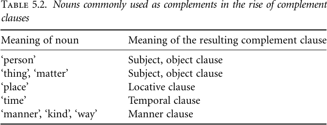 Nouns serving as complements normally have a generic meaning, standing for ontological categories such as PERSON, THING, PLACE, TIME, or MANNER; Table 5.2 lists the kinds of nouns most commonly used cross linguistically. There is some variation in the way this process affects the structure of the emerging complementizer. The following are the most common developments: