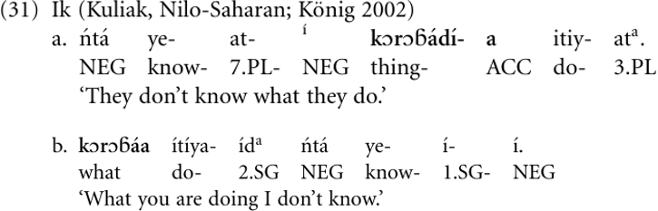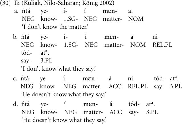 The rise of new complementizers can be demonstrated with the following examples from Ik, a language of northeastern Uganda having verb-initial (VSO) basic word order and an elaborate case system distinguishing seven case categories. What makes Ik an interesting case for our purposes is that it exhibits a typologically unusual property: It has an extremely conservative case system which is retained even if a noun is grammaticalized into some other word category. The result is that in this language there are case-marked adverbs, adpositions, adverbial conjunctions, and complementizers (König 2002). This fact allows us to reconstruct a situation where all the items that are inflected for case are historically derived from nouns. For example, mεna is a plural noun meaning ‘matter’, taking plural agreement. Sentence (30a) illustrates its nominal and (30b) its complementizer use, where mεna is followed by a complement clause. Note that the object noun is inflected in the nominative case (NOM): There is a rule in Ik according to which objects are coded in the nominative when the subject has first- or second-person reference. Consequently, the object appears in the accusative in (30c) since the subject has third-person reference. One might argue that mεna is not a complementizer but a noun in all these sentences. But this analysis would raise a problem: When a noun is followed by a clause, that clause must be introduced by the relative clause marker na, plural ni. This is in fact the case in (30b) and (30c); however, the relative marker can be omitted (optional REL-loss) whenever mεna functions as a complementizer, as in (30d), but never when it is used as a noun. In other words, mεna has the function of a complementizer but, with one exception, the morphosyntax of a noun.