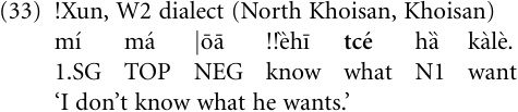 As a result of decategorialization and erosion, complementizers tend to become increasingly dissimilar from their lexical sources, losing both nominal properties and phonetic substance. The following example (33) from the !Xun language of southwestern Africa illustrates the grammaticalized output of the process: The complementizer tce̒ is the compressed version of a noun phrase, consisting diachronically of the noun tcı̒ ‘thing’ and the relative clause marker-è, hence tcı̒-è > tce̒. Thus, (33) means historically ‘I don’t know the thing that he wants’.