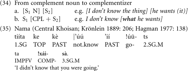 Conceivably, some languages have experienced a process straight from relative marker to complementizer (Lehmann 1995: 1213–14; Heine and Kuteva 2002a). For example, the relative marker xa= of the Oto-Manguean language Chalcatongo Mixtec is said to have given rise to a complementizer (Macaulay 1996: 153, 160), and the same is claimed for the Thai relative marker thı̂i (Bisang 1998: 780) and the relative pronoun she/ asher of Early Biblical Hebrew (Cristofaro 1998: 64–5). Note, however, that—as pointed out already in Heine and Kuteva (2002a: 254)—more research is needed on the structure, and the genetic and areal distribution of this development. In other languages again there is no evidence of relativization; the following examples suggest that the complement clause is added to the complement noun without any formal marking. The result is that the complement noun is grammaticalized to a complementizing pronoun; thus, instead of (27) we have (34).2 The following examples, both involving verb-final languages, illustrate this channel; note that in these languages the modifier precedes its head. In the Namibian Khoisan language Nama, the noun !xa̒i-s (!xa̒i-sà oblique case) ‘matter, story’ has given rise to the object clause complementizing pronoun !xa̒i-’è, !xa̒i-sà ‘that’, ‘whether’, and, as such, is still inflected like a noun, cf. (35).