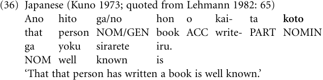 In a similar fashion, the Japanese nominalizer or complementizer koto has the etymological meaning ‘thing’ (Lehmann 1982: 65); the following example illustrates its use as a complementizer. Like Nama, Japanese is an SOV language, hence the complementizer follows its complement clause.