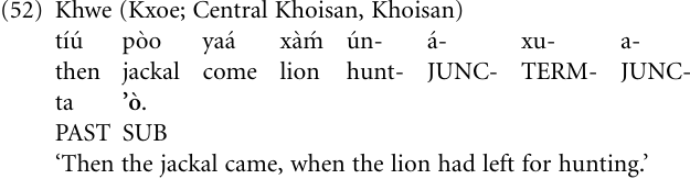 In a way similar to that for complementizers, general locative and temporal nouns such as ‘place’, ‘interior’, ‘time’ provide a common source for adverbial subordinators. In the Namibian language Khwe (Kxoe), o̒o̒ is a noun meaning ‘inside, place’ which appears to have been grammaticalized to a locative postposition ˡo ‘at’ and to a clause-final subordinator (SUB) of temporal, causal, and modal clauses, for example: