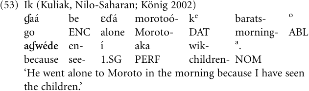 In the Ugandan language Ik, the form aɠwe̒de is composed of the relational noun aɠwa ‘inside’ plus the third person possessive suffix -e̒de, hence its lexical meaning is ‘its inside’, while its grammaticalized function is that of a reason conjunction ‘because’, introducing reason clauses which obligatorily follow the main clause, cf. (53).