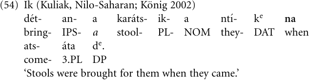 We observed above (“The noun channel”) that the Ik noun na ‘place’ was grammaticalized to a locative complementizer, na ‘where’, which has retained a number of nominal properties: Like its lexical source, it has a locative function, takes the relative clause marker na, even if the use of this marker is optional, and it is case-inflected. As an adverbial clause conjunction it is more strongly grammaticalized: Having either a temporal or conditional function, it has lost the ability to take a relative clause marker and to be inflected for case, cf. (54). Like the complementizer, it can follow or precede the main clause.