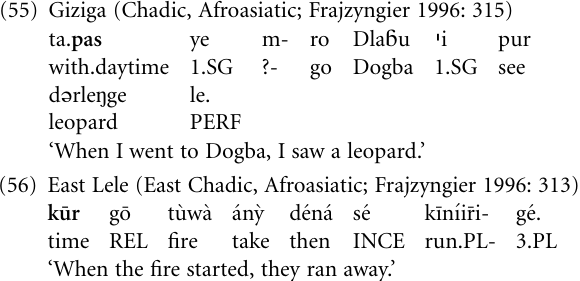 Temporal subordinate clauses are frequently formed via the grammaticalization of nouns for ‘time’. For example, the subordinator most commonly used to explicitly signal a temporal relationship between clauses both in Classical Newari and the Kathmandu dialect of Newari is belas (in the modern dialect bale), which is formed from a noun meaning ‘time’ (Genetti 1991: 235). Much the same observation has been made in other languages. In his detailed study of Chadic languages, Frajzyngier (1996: 313) observes: ‘‘A source for ‘when’ expressions in Chadic that [is] one of the easiest to identify is the word for ‘time’.’’ This grammaticalization involves either a bare noun for ‘time’ or ‘place’, or the noun plus an adposition (55), or a relative clause marker (56).