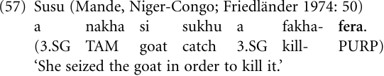 Nouns for ‘thing’, ‘matter’ provide a common source for complementizers, as we saw in “The noun channel”, but they may also grammaticalize into adverbial clause subordinators. In the Mande language Susu, the noun fe ‘matter’, ‘affair’ appears to have given rise to a de-verbal nominalizer and to the purpose clause subordinator-fe, or-fera (-ra = multi-purpose particle) purpose marker, for example: