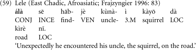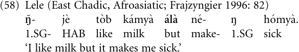 Frajzyngier (1996: 83) reconstructs the following process of grammaticalization: The noun a̒là ‘God’ came to serve as an exclamation marker of surprise, and from there as a marker of an unexpected proposition, cf. (59). In certain contexts, the marker was reinterpreted as an adversative conjunction, as in (58). Such contexts involved situations where in a sequence of two clauses the second clause was interpreted as the unexpected consequence or outcome of the first clause.