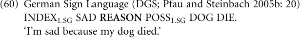 Evidence for a development from noun to adverbial clause conjunction can also be found in signed languages. In German Sign Language (DGS), the noun sign REASON has given rise to a reason subordinator, as in the following example; unlike the noun REASON, the grammaticalized sign REASON shows erosion in that it is linked with the following subordinate clause without any prosodic break: