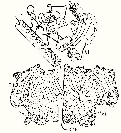 Figure 1. Structural organization of cholera toxin and related toxins, showing a cross section of the molecule of cholera toxin and the E. coli heat-labile enterotoxins (1, 3, 4). A is composed of two polypeptide chains: A1, endowed with ADP-ribosyltransferase activity, and A2, which consists of a long a-helix, involved in interaction with A1, followed by a structureless segment that penetrates the small central hole of the B pentamer. Each of the five B subunits forming the B oligomer has a binding site for the oligosaccharide portion of the ganglioside GM1. Thus, cholera toxin binds to the membrane via multiple interactions, with the catalytic A1 subunit pointing away from the membrane, with little protein–protein contact between A1 and B.