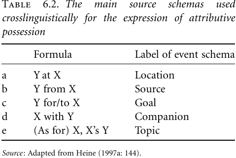 Possessive constructions and the recursive structure associated with them can frequently be traced back to non-recursive structures. These constructions are frequently encoded by case markers, in particular genitive inflections. Most of these case markers are etymologically opaque, that is, their genesis is beyond the scope of the methodology of historical linguistics. But there are case markers and the possessive constructions associated with them for which there exists sufficient diachronic evidence to allow for generalizations on their genesis. The diachronic sources of these constructions are discussed in Heine (1997a; see also Heine and Kuteva 2002a: 34–5) and the reader is referred to these works for more details. The main conceptual schemas serving as sources for the rise of attributive possession are listed in Table 6.2.
