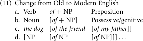 The change from Early Middle English to Modern English was marked by extension and desemanticization: of was extended to more and more contexts, spreading from one noun to another, increasingly encroaching on the domain reserved for the inflectional genitive. And from Middle English onwards it became the primary means for expressing attributive possession—turning into a fully productive marker of linking nouns. In other words, what used to be an adverb and preposition turned into a new case marker of noun phrase syntax in a process leading from a structure like (11a) to one like (11b). The result is that English acquired a new pattern of recursive syntax, illustrated in (11c), whose structure can be described as in (11d).