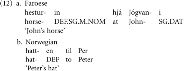 Much the same process happened in other European languages. In a number of northern European languages it was not the source schema of Table 6.2 but the location schema that was used to create new possessive constructions along the same lines, where a locative preposition ‘at’ was grammaticalized to a possessive/genitive case marker, such as Faroese hja̒ ‘at’, Scottish Gaelic aig ‘at’, or Irish ag ‘at’; cf. (12a). In the case of the goal schema, attributive possession can be traced back to a directional, allative or benefactive adverbial phrase, where the adposition turned into a possessive case marker, as appears to have happened with Norwegian til ‘to’, illustrated in (12b).