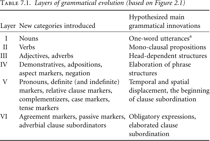 And third, our reconstruction suggests that language evolved gradually in an incremental fashion, constantly acquiring new grammatical use patterns and categories, and becoming increasingly more complex (see also Pinker 1994; Jackendoff 2002). There is no convincing evidence for something like ‘‘protolanguage’’ as standing out as a distinct stage in this evolution. If in fact there was a more salient stage then more likely it would have been located somewhere around layer V, when some more dramatic innovations were made, as we saw above. And even this stage falls out naturally from the preceding stages, being an elaboration of previous structures via parameters of grammaticalization—parameters that we hypothesize to have been essentially the same from the beginning of human language up to the modern languages as we find them today.