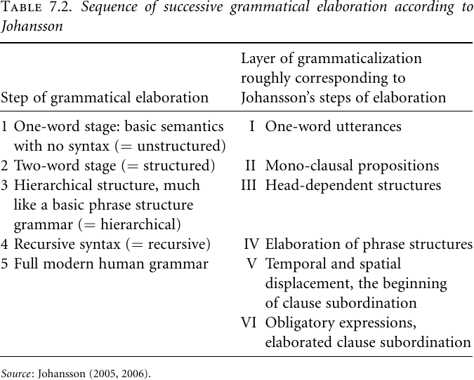 On the basis of these features he proposes a five-stage model of successive grammatical elaboration, as depicted in Table 7.2. This table shows that there are significant correspondences with the scenario of grammaticalization of Table7.1. in Grammatical evolution Layers, While the status of feature(c) in this model does not become entirely clear, it would seem that, overall, the sequence postulated by Johans son captures a major line of progression in the grammaticalization of language structure, namely one leading from elementary utterances without internal structure to structural relations among word units, subsequently to complex, hierarchical structures, and finally to clause subordination and recursive syntax.14