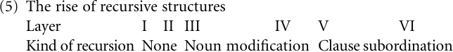 (n) How did the properties believed to be restricted to modern human languages arise, in particular syntax and the recursive use of language structures? We saw how syntax gradually evolved from one layer of grammaticalization to the next. But the main issue associated with this question is the rise of the recursive use of language structures. As we saw in “Early language Layers”, recursive structure was not present at the earliest layers of language evolution but must have emerged subsequently after the appearance of hierarchical noun phrase structure. It is only considerably later that recursive clause subordination came into being. Thus, our scenario suggests a development as sketched in (5).