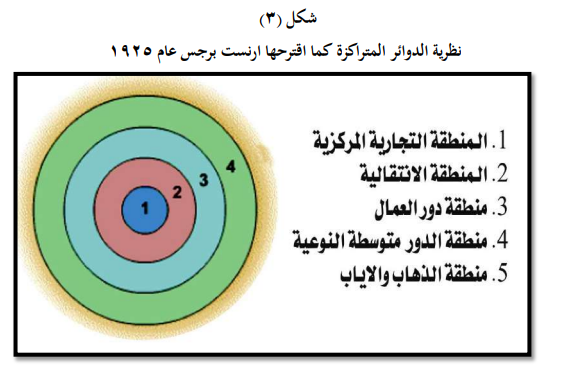 ظهر هذا النموذج في عام (1925) من قبل الباحث الاجتماعي ارنست برجس الذي قام بتقسيم مدينة شيكاغو في الولايات المتحدة الى خمسة انطقه لها مركز واحد متمثلاً بمنطقة التجارية المركزيةC.B.D) ) حيث عدّ قوى السوق هو المحرك الاساس لتكوين تلك الانطقة ، كما توصل الى ان نمو المدينة وتوسعها يبدأ من المركز نحو الاطراف ، واشار ان سبب التوسع ناتج عن حالة الضغط الذي يولده نمو المنطقة التجارية المركزية والصناعية على المنطقة السكنية الى جانب نمو الوظيفة السكنية ورغبتها بالابتعاد عن مركز المدينة المزدحم الذي يشوبه كثرة الضوضاء ، لاسيما عندما ترتفع مستويات الدخول للسكان القاطنين حول المنطقة التجارية المركزية ، وهذا التوسع كما يفرضه (برجس) يجب ان يكون على شكل ( 5 ) مناطق دائرية تحيط الواحدة منها بالأخرى وبالتالي اعتقد ان نموذجه يمكن ان يطبق على جميع المدن وعلى وجه الخصوص المدن الكبيرة ، وعموما توصل برجس الى عدة محاور من نموذجه يمكن اظهارها بالنقاط الاتية: