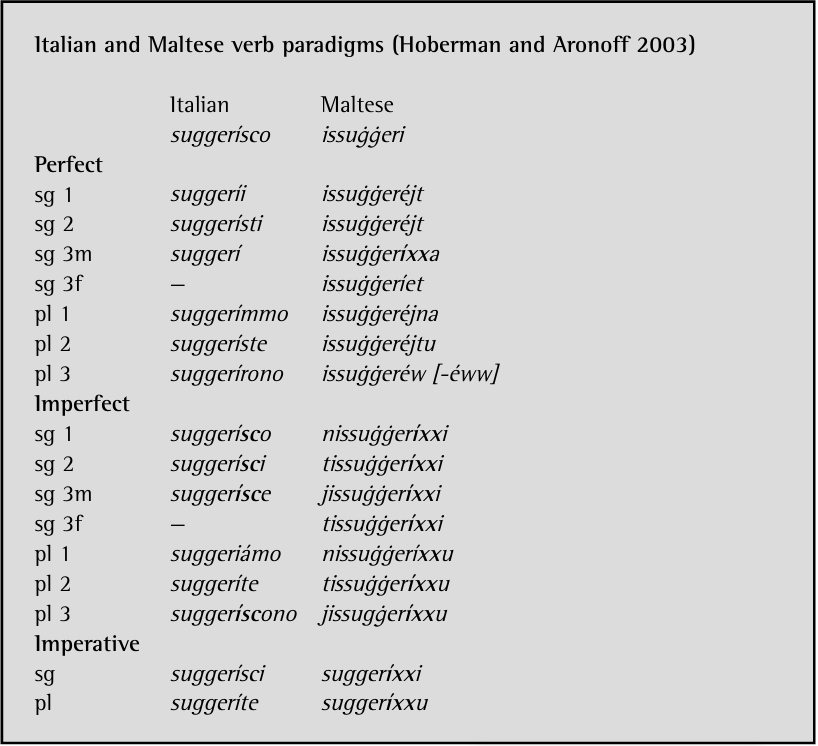 Maltese is a Semitic language. Semitic is known for root-and-pattern morphology, as we saw in Root-and-pattern morphology Over the course of time, however, the productive verbal morphology of Maltese has become affixal, with only relics of the original root-and-pattern type remaining (Hoberman and Aronoff 2003). One consequence of this change is that Maltese easily borrows verbs intact from other languages – especially Romance. This is not so straightforward in other Semitic languages like Hebrew and Arabic. For example, as noted by Hoberman and Aronoff, Hebrew borrows nouns intact (e.g., telefon), but verbs are adjusted to the morphological patterns of Hebrew. Thus, one form of the verb ‘to telephone’ is tilfen.